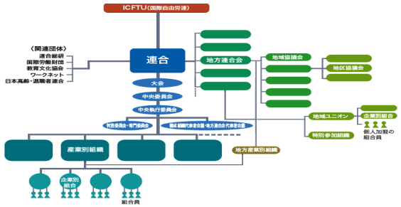 連合の最高意思決定機関は大会です。そのもとに中央委員会と中央執行委員会があります。