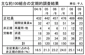 問題は派遣です。一気に3倍にまで増えていますが、請負は一定の数値でとどまっています。2008年6月時点でみると、非正規の比率は25.1%でしたが、リーマンショック以降減少します。2009年6月時点で、正社員は若干伸びていますが、期間従業員と派遣は大幅に減少しています。非正規の比率は14.2%にまで下がっています。