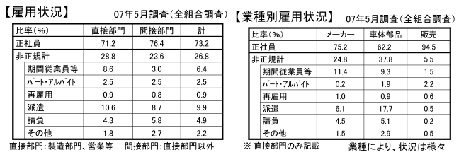 次に、業種別雇用状況の表をみてください。メーカーや車体部品、販売を比較すると、メーカーや車体・部品部門では派遣と期間従業員が多く、販売会社では非正規の比率自体が低く、比較的パートが多くなっています。これは、販売会社で自動車を売った後に必要な業務処理のための書類の整理や、新車の洗浄の仕事等にパートやアルバイトが多く採用されていることなどからきています。業種によっても状況はさまざまです。