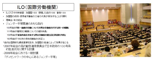 2009年には、ILOが「ディーセントワーク―人間らしい当たり前の働き方―の中心にあるジェンダー平等」を大きく掲げ、これについて、1週間議論をして決議が採択されました。