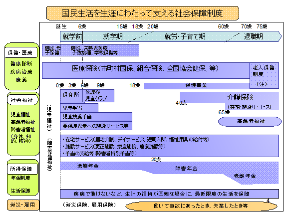 ライフサイクルに対応して、どのような社会保障制度が適用されるかを図解した資料を配布しています。