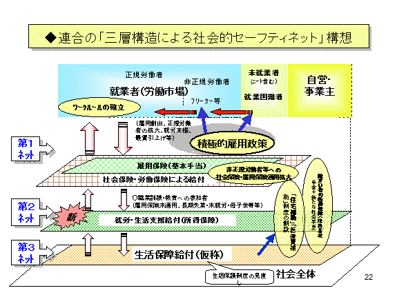 連合は、積極的雇用政策と社会保障政策との連携による3層構造の社会的なセーフティネットの再構築を提案しています。