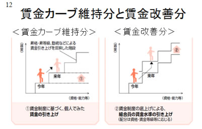 つづいて、賃金カーブ維持分と賃金改善分です(スライド12)。いわゆる賃金カーブ維持分というのは定期昇給です。賃金改善分というのはいわゆるベア、ベースアップといわれるものです。