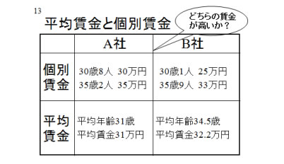 もう1つ、平均賃金と個別賃金があります(スライド13)。このA社とB社、見たときにどっちの賃金がいいと思いますか。A社の平均賃金32.2万円、B社は31万円と、平均賃金で見るとこのような見え方をします。これを個別賃金でそれぞれ見たときにどうですか。実は個々人で見ればA社のほうが高い賃金です。ただ、平均賃金で表すと、B社のほうが高くみえます。賃金は平均賃金だけを見ていてもその会社の賃金の実態がよくわかりません。個別賃金で見たときにどういう賃金実態になっているかをみていかないと賃金の実態はわかりません。