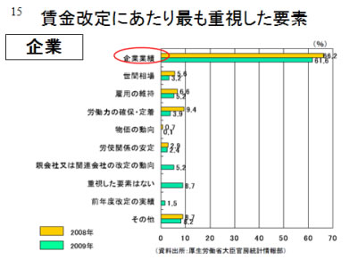 他方、一時金(ボーナス)は一般に業績に連動するものですから、業績がいいときは増えるし、業績が悪くなると減ってしまいます。一時金の方が上下動する要素が強いです。賃金と一時金にはそのような性格の違いがあります。