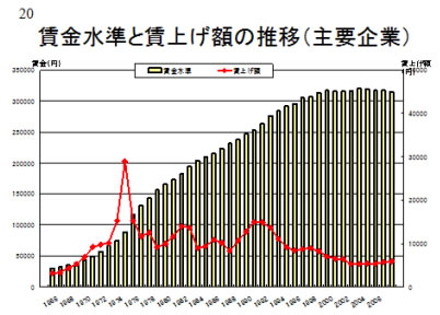表(スライド20)は賃金水準と、賃上げ額の推移です。1965年は、まだ全体の主要企業の賃金といっても3万円程度の水準です。それから賃上げによって、賃金水準が上がってきました。今は30万円をこえるぐらいにまであがってきています。最近の賃上げ交渉の環境は、日本の経済状況、あるいはグローバル競争の波の中で非常に厳しく、2パーセント前後の賃上げ率になってきています。