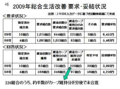2009年の春闘の取り組みの結果を表(スライド48)にまとめてみました。リーマンショックの影響があり、回答の結果が非常に厳しくなりました。賃金改善分は、2008年に比べると10分の1、さらに賃金カーブ維持分が確保できなかった、割れてしまった組合も、2008年は97しかありませんでしたが、2009年は220になり、2009年は非常に厳しい結果です。