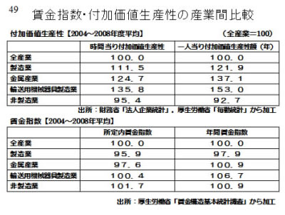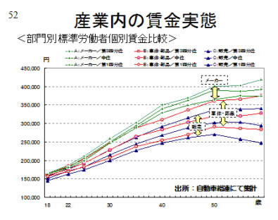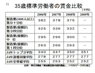 表(スライド51)は2006年から2008年の35歳標準労働者の賃金水準です。トップ3というのは、これはトヨタ、日産、ホンダの大手の3社です。この大手の3社ですら製造業の第3四分位、まん中よりちょっと上のところよりは多少いいぐらいです。第9十分位の製造業の1000人以上の企業の賃金水準と比べると自動車のトップ3の賃金水準は下回っています。産業間の賃金水準の格差の是正をめざしてやっていかないといけません。
