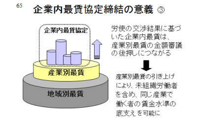 この産業別最賃を決めるにあたって、企業内の最低賃金協定が非常に重要な役割を果たします。労働組合としては、企業内最賃協定を結んでこの特定最賃の底上げをはかる取り組みを行っています。