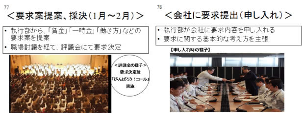 これ(スライド78)は申し入れの時の写真です。要求が決まれば執行部が職場の代表という形で会社に申し入れを行います。労務担当の副社長が会社を代表して執行委員長から要求書を受け取るところから交渉が始まります。このときは組合執行部だけでも60人、会社のほうも20人ぐらい参加しました。