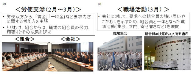 これ(スライド80)は職場活動の風景です。会社との交渉をするにあたっては執行部だけでは力になりません。職場のみんなが要求にかける強い思いを会社にしっかり示していくのが会社を動かす非常に大きな力になります。それぞれの職場で職場集会を開いて、交渉状況を報告します。最後に気持ち合わせの「頑張ろう」をやったり、職場で寄せ書もします。職場ごとに今回の春闘にかける決意をみんなに書いてもらい、職場の思いを執行部の事務所に掲示したり、あるいは写しを各職場の部長や役員のところに持って行きます。多くの組合員がこういう思いのもとに春闘に取り組んでいますと職場の気持ちをしっかり表わすのが春闘を行うにあたって非常に重要なポイントになります。こういう活動をそれぞれの組合で工夫をこらしながらやっています。