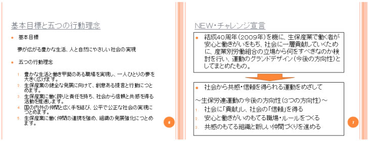 スライド6に基本目標と5つの行動理念と書いてあります。生保労連という組織が目指す社会をまとめてあります。生保産業が健全に発展していくように、そこに働くわれわれが生き生きと働けるように目標と理念を立てています。