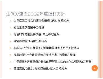 次は、2009年度運動方針です(スライド8)。労働組合は必ず運動方針を掲げて取り組みを進めています。生保労連も、ご覧いただいているような8本の柱を掲げて取り組みを進めています。1つ目の「生保産業の社会的使命の達成に向けた取り組み」は、そもそも生保産業は何のために存在するのかということをしっかり労働組合の立場から考えよう、というものです。生命保険というのはいざというときに保険金や給付金をお支払いすることが産業の最大の目的です。そしてまた日本がこれから間違いなく突き進む少子高齢社会や日本の公的保障の限界性を考えると、生保産業の果たすべき役割は小さくないと思います。そう考え、しっかり私たちの役割を果たしていこうと、運動方針の1番目に掲げて取り組んでいます。