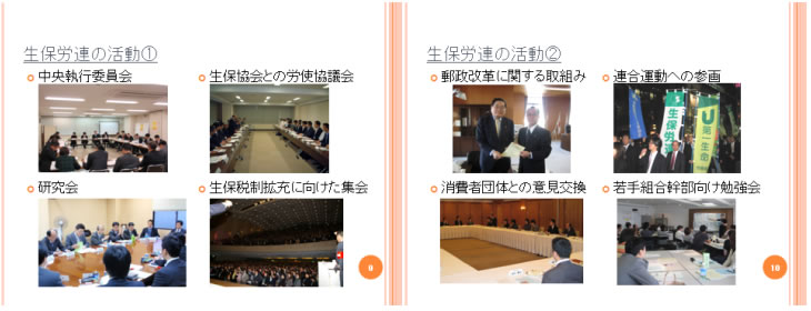 次のスライド(スライド10)は、郵政改革に関する取組みについてのもので、右側の人は生保労連の委員長です。左側はみなさんご存知の人です。私たちは郵政改革に対して組合員や職場の非組合員に署名活動をしました。86万件の署名を集めて、それを亀井大臣や原口総務大臣にも届けたり、民主党の幹事長室にアピールしにいったりしています。左下は、地方の消費者団体の方々と意見交換を行って、生命保険営業やサービスのあり方について、こんな所に苦情があるといったことを聞いています。右上は連合の集会です。アピールするために街を歩いたときの写真です。勉強会も実施しています。