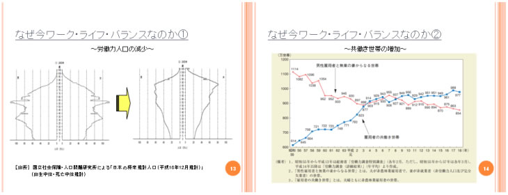 なぜ今ワーク・ライフ・バランスなのか。よく言われていることをいくつかご紹介します。まず人口です。これ(スライド13)は年齢別人口分布です。2005年と2055年の推計値です。50年間で人口の分布が相当変わってきます。働く人が少なくなってきます。50年間で1億2千万人が9千万人ぐらいまで減ります。今から3000万人ぐらい減ります。県でいうと、一番小さい鳥取県から29番目の群馬県までの人口合計分の3487万人ぐらいが減るというようなインパクトといわれています。65歳以上を老齢人口といいます。現在は、老齢の方と現役の割合が、1:3.3と言われていますが、それが1:1.3となります。長妻厚生労働大臣がよくいわれる「騎馬戦が肩車になる」状況です。かなり人口の分布が変わっていきます。働き手が減れば経済力も衰えて、今まで維持してきたインフラや道路などだけでなく社会保障制度なども含めた日本全体のインフラを維持することが難しくなります。