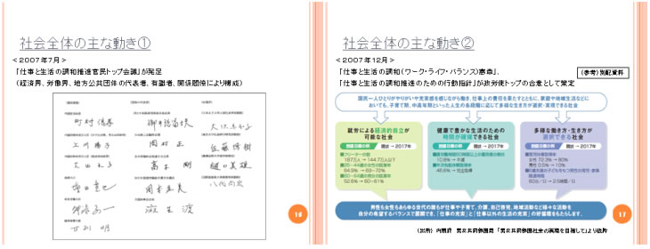 こうした背景を受けて、2007年7月に、「仕事と生活の調和推進官民トップ会議」という組織が立ち上がりました。メンバーはスライドに記載の通りです(スライド16)。自民党に属されている方々は最近露出が小さくなっていますが、有力者が名を連ねています。真ん中には労使代表として日本経団連の御手洗会長や連合の髙木会長が、一番右側には有識者と呼ばれる方々の名前が並んでいます。このような人たちがトップ会議を構成して議論していこうということになりました。また、政労使のそれぞれから実務者が集まって、議論を進めていきました。