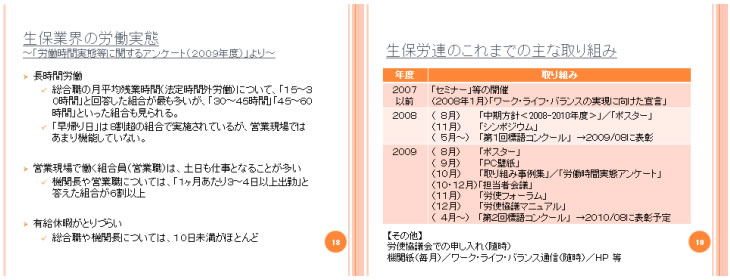 これではいけないということで、生保労連としての取り組みを進めています。2007年以降の主たる取り組みを表にしてみました(スライド19)。2007年頃あるいはそれ以前はセミナーや研究会を開催して私たち自身が勉強していました。どんな人に来てもらったかというと、先ほどトップ会議にありました東京大学の佐藤先生とか慶応義塾大学の樋口先生などに生保労連の会議に来てもらって、取り組みについて検討を進めました。そして、2008年の1月に、「ワーク・ライフ・バランスの実現に向けた宣言」を確認しました。2008年8月から中期方針として、向こう3年ぐらいを目途として取り組むことを決めて、あとは着々と取り組みを進めてきました。労使協議会での申し入れや組合員向けの毎月発行している新聞などでワーク・ライフ・バランスを訴えかけるなどをしてきました。