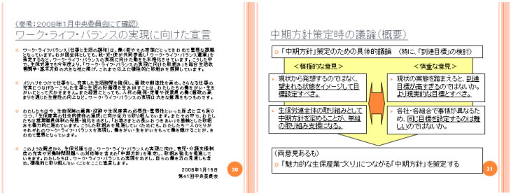「ワーク・ライフ・バランスの実現に向けた宣言」(スライド20)に生保労連の考えがかなり凝縮してあります。2つ目までは世の中の動きや取り組みの意義について書いてあります。3つ目は生保産業ならではというところです。生保産業の社会的使命は、いざというときに保険金、給付金をお支払いすることです。生命保険契約は、ご契約いただいてすぐに保険金や給付金が支払われるような場合もありますが、10年後・20年後だったり30年後にお支払いするといったことも多い、契約の長期性というのが特徴です。長きにわたってお客さまをしっかりフォローしていくような体制が業界としては求められるわけです。そのためには従業員が、営業職も内勤職も長らくイキイキと働き続けて、お客さまに対するサービスに努められることがとても大切だとして、この項目が入っています。自分たちの働き方も見直して、より生産性の高い取り組みをやっていかなければと、この宣言をまとめました。