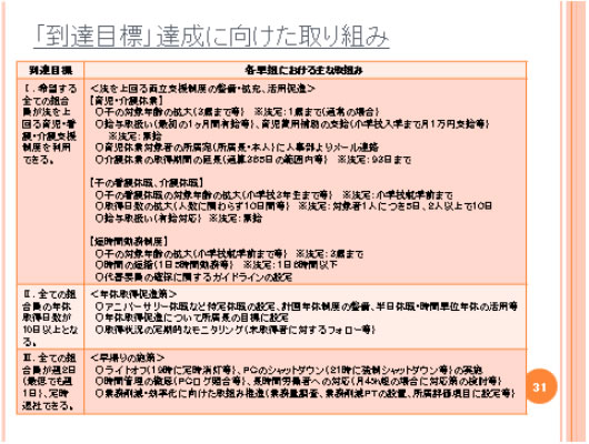 到達目標は3つです。1つ目は希望するすべての組合員が法を上回る育児・看護・介護支援制度を利用できること、2つ目はすべての組合員の年休取得日数が10日以上になること、3つ目はすべての組合員が週2日(最低でも週1日)定時退社できることです。