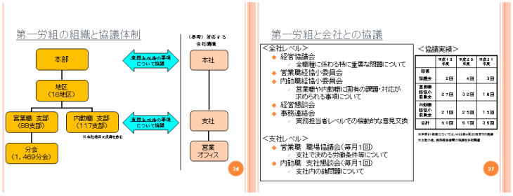 組合本部と本社、支部と支社レベルでそれぞれ協議をしています。どんな協議をしているかというと、全社レベルでの協議、例えば全職種に係わることは経営協議会でやるし、営業職固有のこと、内勤職固有のことは小委員会という枠組みでやっています。あるいは支社は支社で協議をしています。スライド(スライド37)の右側にあるのは、本社レベルの協議実績です。年間あわせて50回以上はやっています。1年間は52週しかないわけですから結構な頻度で労使協議をしています。特に、今日のテーマに関連すると、例えば内勤職の勤務について20回規模でやっています。毎回というわけではないですが、人事制度や勤務に関する協議があります。かなりの頻度で協議しているということがわかって頂けると思います。支部では、例えば立川支部のエリアで働く人たちの日々の仕事ぶり、朝から晩まで働いているとか、タイトなスケジュールで働いているとか、そういったことを少しでも改善するように申し入れたりしています。