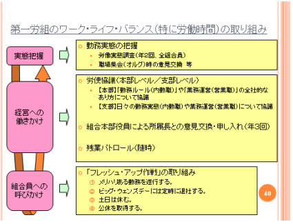 第一労組のワーク・ライフ・バランスの取り組みについて、特に労働時間について触れます。大きな流れはなんといってもまず実態を把握することです。その上で、経営側に働きかけをしていく。組合は組合員に対して伝えていく。組合として自分たちでできる取り組みを自発的にしていくということです(スライド40)。