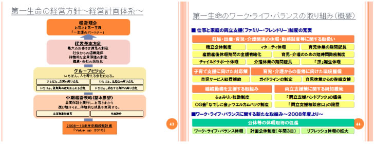 少し話が飛びますが、第一生命の経営方針について触れます。左の図(スライド43)は第一生命の中期経営計画や経営理念をひとつの体系として示しています。このグループビジョンのところを見て下さい。「いちばん、人を考える会社になる」とあります。お客様のこともそうだし、従業員の活気があふれるような会社にしていかなければいけないと打ち出されています。こういった考え方のもとにワーク・ライフ・バランスをしっかりと遂行していこうということが具体的に示されています。