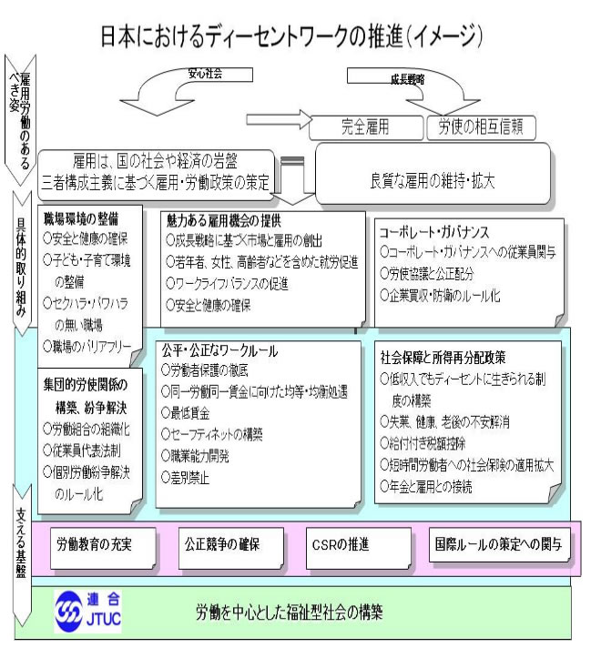 下図は、日本におけるディーセントワーク推進についての連合の政策としてのイメージ図です。ディーセントワークを実現するために、雇用のあるべき姿、そのための具体的取り組み、支える基盤等について示しています。
