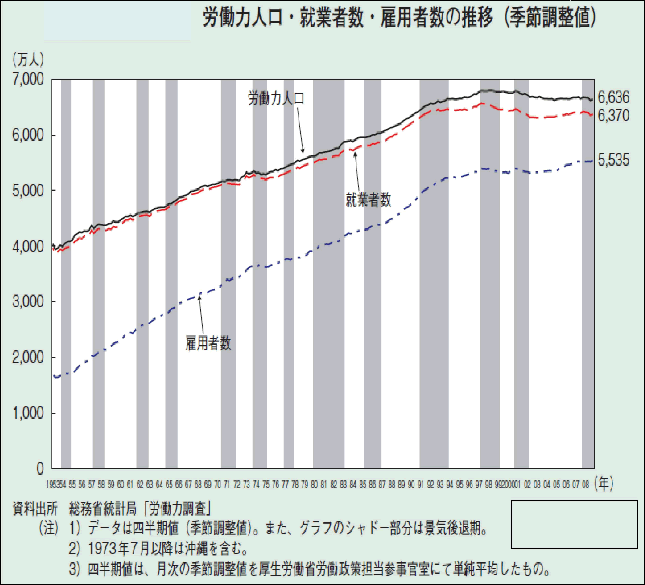 就業者というのは、自営業、農業、林業、漁業など職業を持っている方です。そのなかに占める雇用者は、雇用関係にある、企業と労働契約を結んで働いている方の数です。この雇用者数はどんどん増えてきています。日本の人口1億3,000万人のうち、2008年では6,370万人が職業を持っていて、そのうちの5,535万人が雇用者です。日本では職業を持っている人の実に87%が雇用関係のもとで働いています。