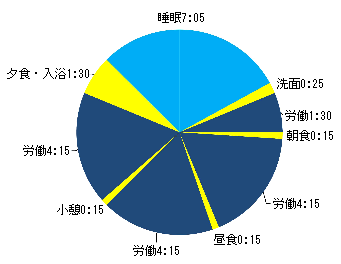 当時の日本の輸出品の第1品目である生糸を扱う製糸工場での女性労働者、女工の労働条件を調べたものです。まず、朝4時に起床します。6時に朝食を15分ですませ、10時30分にまた15分で昼食、15時に15分間の休憩をとり、終業が19時30分です。実に1日の総労働時間が14時間15分という数字です。
