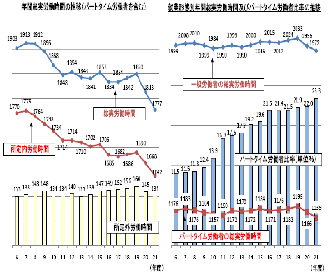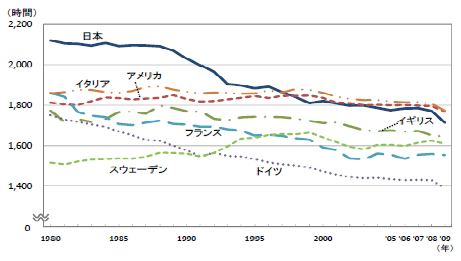 次に日本の総労働時間の傾向についてお話しします。日本の労働時間は、1980年代から先進国のなかで一番長かったのです。ドイツが一番短いのですが、ヨーロッパは総じて短いです。日本はだんだん短縮されて、やっとアメリカ並みになってきました。