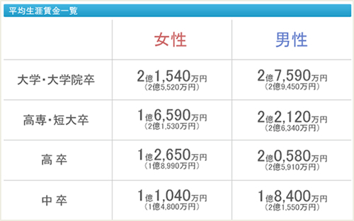図表1は、2005年の日本における平均生涯賃金を示したものです。これは性別と学歴別で、入社してから定年退職するまでの生涯賃金がいくらなのかを統計で見たものです。学歴によってそれぞれ生涯賃金に差があることが見て取れます。女性と男性でも違います。職業や各企業の人事任用制度によって違う部分もたくさんあります。女性が働きやすい環境をつくらないと、日本の経済状況も良くならないと言われていますが、労働組合も企業側も、そうした取り組みを進めていかなければならないということを、このデータから考えさせられます。