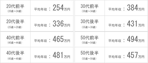 図表2は、年代別の平均年収を示したものです。低いと思われるかもしれませんが、このデータは、色々な仕事、職種を含めてすべて平均し、正社員ベースで統計をとったものです。20代前半で大体年収が250万円前後、20代後半になると300万円オーバーになっています。