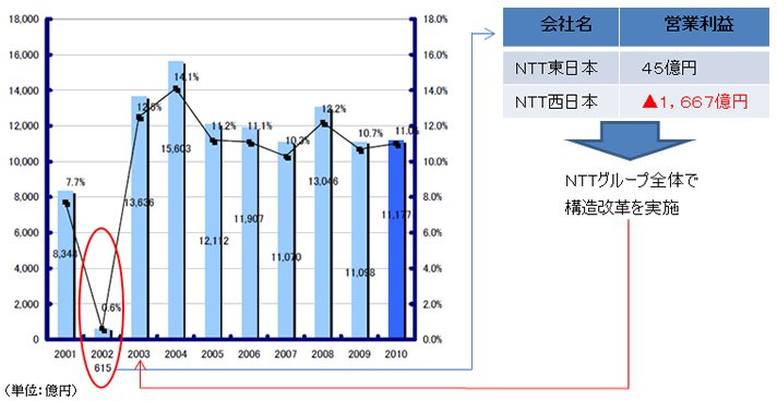 また、マイラインという制度も導入され、事前に電話機で通信事業者を設定しておけば、特定の番号を指定せずに電話を掛けた場合、NTT以外の他事業者につながるという制度です。このマイライン制度が導入されたことによって、電話会社間の競争が激化するとともに、接続料の大幅引き下げに伴い、NTTの接続料収入は急激に落ち込みました。このとき、NTT西日本は営業利益で1,600億円を超える赤字を出すとともに、NTT東日本も赤字転落すれすれの状況で、営業利益は45億円となってしまいました。地域通信事業の当時の従業員は8万人いたわけですから、雇用にかかわる危機的な状況に至ったということです。