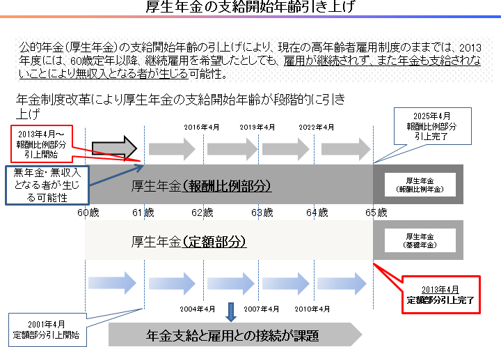 NTTグループの構造改革後に国の社会保障制度も大きく変わりました。厚生年金の定額部分についてはすでに65歳支給に変わっていますが、2013年4月からは定額ではない部分、いわゆる報酬比例部分を、毎年徐々に65歳まで支給年齢を遅らせることになりました(図表6)。これに企業がどう対応していくか、考えなければなりません。また、高齢者雇用安定法の改正によって、企業は65歳までの雇用を義務化されます。経過措置に伴い、2025年の報酬比例部分の引き上げ完了までは1年雇用とすることも可能ですが、企業の経営者は法改正への対応を考えていかなければなりません。
