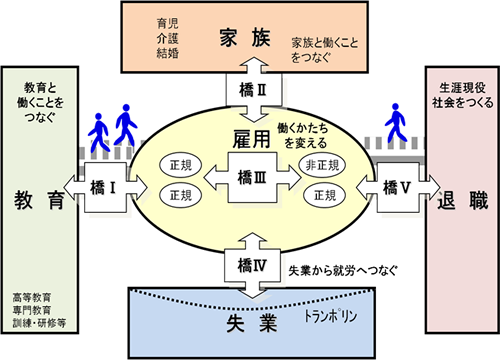 連合は「働くことを軸とする安心社会」に向けて目指すべき社会像を提起し、「働くこと」を軸に5つの橋をかけたいと考えています(図表2)。1つめの橋は、「教育と雇用」をつなぐ橋です。働くとはどういうことなのか、働くために何を知っておくべきなのか、高校・大学のときから考えてもらいたいのです。2つめの橋は、「家族と雇用」をつなぐ橋です。介護や育児のために仕事を辞めざるをえなくても、それが終わったら、正規であれ非正規であれ、また職場に戻ってこられるようにしたいと考えています。3つめの橋は、「雇用と雇用」をつなぐ橋です。正規から非正規へ、または非正規から正規へ、雇用を往き来できる橋をかけたいと考えています。もし非正規になっても、経験を活かしながらまたもう一度、正規にチャレンジできる制度をつくりたいのです。4つめの橋は、「失業と雇用」をつなぐ橋です。企業もずっと良いわけではありません。倒産してしまった場合に、スキルアップのための職業訓練を受け、次の雇用につなげることが必要です。5つめの橋は、「退職と雇用」をつなぐ橋です。定年退職を迎えた時、地域社会で何かできることがあるのではないか。地域と働くことを結びつけ、生涯現役社会をつくりたいと考えています。このように、「働くこと」を中心に5つの橋をかけたいと連合は提起しています。