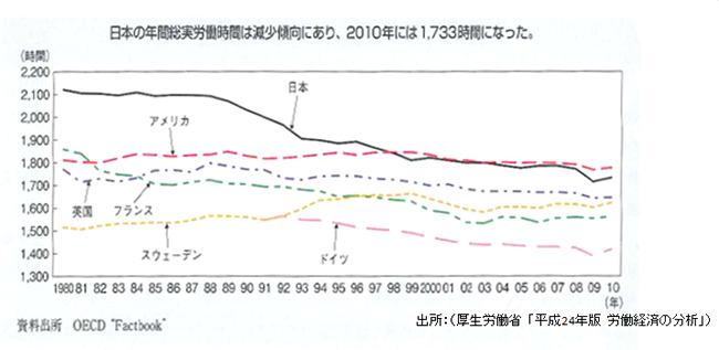 日本では労働時間の長い状況が続いてきました。とくに1980年代はダントツで長く、日本の貿易黒字に対し外国からは、「日本は労働者を長時間働かせて、安い品物を売っていてアンフェアである」という指摘を受けました。こうした指摘を受けた日本政府は、1992年に「時短促進法(「労働時間の短縮の促進に関する臨時措置法」、5年間の時限立法として施行)」をつくり、労使で労働時間を短くしていく取り組みが進められました。