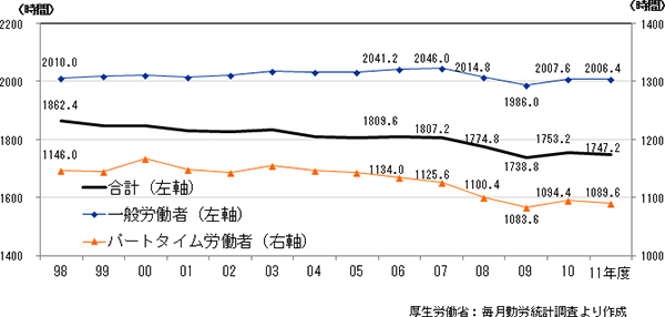 ところで、このグラフからは、日本の労働時間が減少傾向にあることがわかります。1980年の年間総実労働時間は2,100時間台でしたが、2010年には1,733時間になっています。しかし、このデータだけで「労働時間が減って良かった」と、鵜呑みにはできません。なぜなら、一般労働者(フルタイム)とパートタイム労働者に分けて労働時間を見てみると(図表2)、一般労働者の労働時間は、2,000時間以上で高止まりしたまま減少していないからです。日本の労働時間が短くなってきたのは、パートタイム労働者の増加が主な要因です。こうした状況から、日本では、働く人の労働時間が二極化していることがわかります。