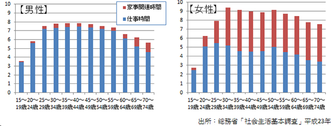 調査結果によれば、男性は長時間働いていて、家の仕事はほとんどしていません。1日12時間も働いていては家のことなどできるはずはありません。一方女性は、パートタイムで働く人が多いこともあり、家事関連時間は長くなっています。