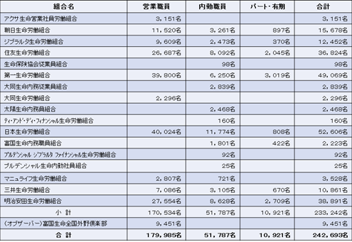 図表1は生保労連に加盟している組合の一覧です。国内に40数社ある生命保険会社のうち16社が加盟しています。未加盟の労働組合がある生保会社には、損保産業の産業別労働組合である損保労連に加盟している労働組合をもつ損保系生保会社や、JP労組に加盟しているかんぽ生命、もともと組合のない外資系生保会社があります。