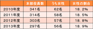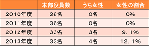 生保労連ではどうかというと、2010年度、2011年度は0名でした(図表2-2)。「こんなに男性社会だと感じたことはない」という私の気持ちを理解いただけるのではないでしょうか。2012年度にようやく私を含め女性役員が選出され、現在4名います。そうやって無理にでも入れていかないと改革は進んでいかないのかもしれません。