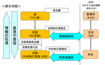 朝日労組は、営業職員で構成された組合と、内勤職員で構成された組合が一緒になり、2001年に結成されました。組合員数は15,678名(うち女性13,753名)です。ユニオンショップ制で、会社に入ると同時に組合員になります。