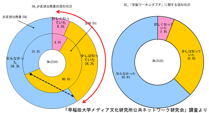 上の左図を見てください。内側が一般的な非正規労働者について聞いたものです。詳しく、あるいは少しは知っていたと答えた割合は約70%です。外側は非正規公務員について聞いたものです。詳しく、あるいは少しは知っていたと答えた割合は約40%に過ぎません。