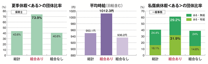 上の表を見れば一目瞭然ですね。組合がある方が、休暇制度はあるし、賃金も多いのです。組合で交渉して処遇を上げていくことがどんなに必要なことなのかが分かります。