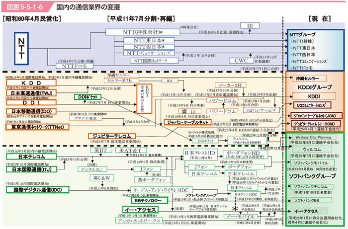 1985年に、「電気通信事業法」が改正され、新しい事業者が参入できるようになったため、国内、国際ともに競争が行われるようになったのです。98年にそれまで国際通信を専門にしていた「KDD」も、国内通信に入るという戦略を取りました。そのため98年12月に「テレウェイ」と合併したのです。この会社は「トヨタ」系の資本が入った会社です。これが通信業界の合従連衡のスタートとなりました。ちなみになぜこの合併が行われたかと言うと、「国際電電」ですから海に光ファイバーを敷くのは得意なのです。御存じだと思いますが、アメリカと通信をするために、光ファイバーが太平洋に数千キロにも渡り、数十本も張り巡らされているわけですし、当時は「ジャパン・インフォメーション・ハイウェイ」という構想があり、日本列島の海底を光ファイバーがグルッと取り巻いていたのです。片や「テレウェイ」という会社は「トヨタ」系列ですから、高速道路に光ファイバーをたくさん持っていました。そこで、海と高速道路で通信を融合させて、国内に参入していけば勝てるのではないかという戦略があったようです。「新生KDD」はそうした思惑によって誕生しました。