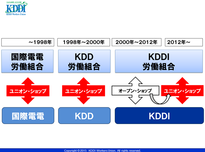 新会社でのユニオン・ショップ制は、その後どうなったのかということですが、合併直前まで結論が出ていなかったため、労働組合としては、合併翌日にも「KDDI労働組合」発足に当たっての我々の態度を表明し、これまでの取り組みをおさらいしながら、早期にユニオン・ショップ協定を結ぶことを改めてお願いしたのです。