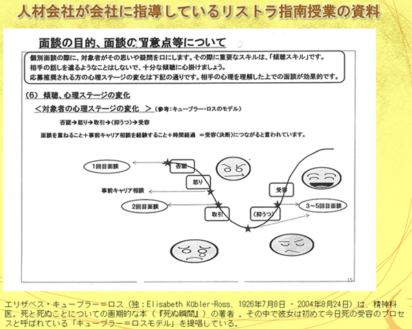 クビを切るというのは、実はものすごくストレスのかかる作業です。資料は、人材(コンサルティング?)会社が会社側に「クビ切りというのは、こういうふうにしなさい」と出しているマニュアルの一部です。退職勧奨の面談の時に非常に傾聴スキルが問われます。辞めてください、と言われてから退職勧奨を受け入れるまでの心理的な動向が書かれています。最初は怒りという形で表れ、次第に気分がどんどんと落ち込んで、3~5週目にかけては抑うつ状態になる。ただこれを過ぎていくと受容にかわっていく。つまり、解雇を受容していきます。