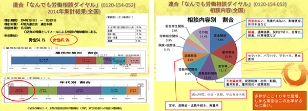 全国での相談件数は、年間15,000件ちょっとくらい。毎年同じくらいの数字です。相談者は、以前は圧倒的に男性でしたが、今は男女半々くらいです。雇用形態は、正社員と非正規労働者が半々です。年代別の割合では、20年前に10・ 20代からの相談はほとんどなく、40・ 50代からが圧倒的でした。しかし、最近では「ブラック企業」が蔓延しているためか、特に10・20代からの相談が非常に増えています。なかでも、大学を卒業してすぐに入った企業が、「ブラック」なのではないか、という問い合わせが非常に多いです。ただ、何をもって「ブラック」なのか、というのは非常に難しい。なんでも偏差値にして表すというのが今の世相で、「ホワイト企業」ランキングで偏差値70を超える企業で、ここヤバいよ、という企業が何社もあって、あてにならないと思います。