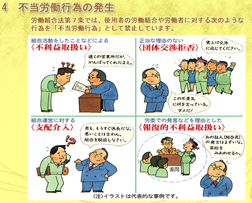 7条1号の違反とは、不利益な取り扱いと言って、例えば、労働組合を結成したことによって、東京営業所から地方の営業所への業務命令を出した場合、これはもう完全な組合つぶしであるということから、このような不利益行為を禁止しています。