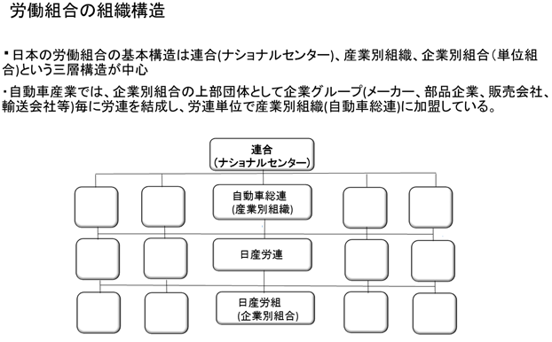 図だと4層に見えるかもしれませんけど、これは自動車産業の特殊な状況がありまして、自動車産業では企業別組合の上にいわゆる企業グループ、例えば、トヨタグループ、日産グループ、ホンダグループ等の企業別組合が集まって、「労連」という組織を作っています。日産の場合は日産労連となります。そして労連単位で産業別組織である自動車総連に加盟しています。労連単位でみると、自動車総連に加盟しているのは、12組織しかありません。