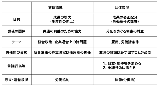 次に、団体交渉と労使協議の違いを表にしてみました。